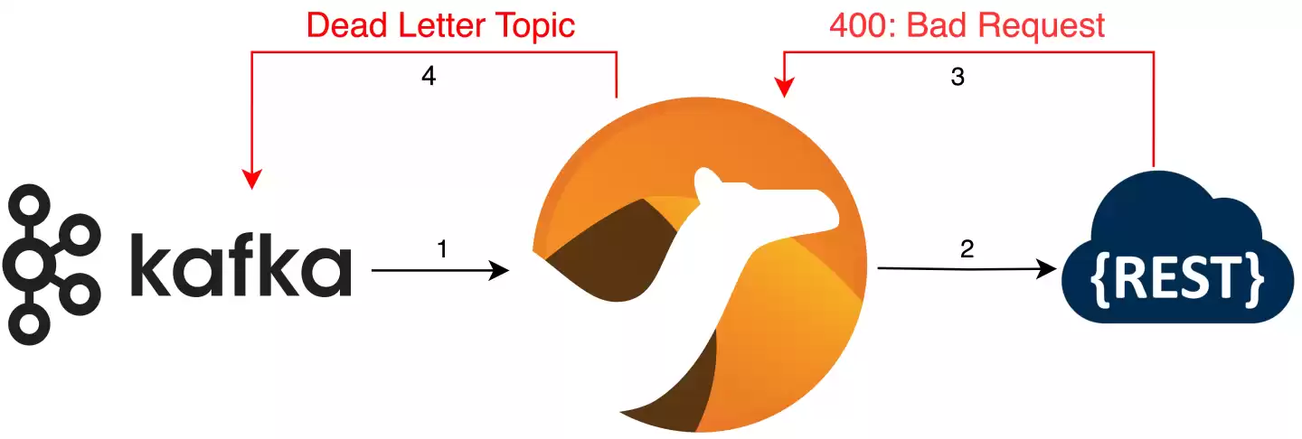 2. fehlerauslösende Nachrichten auffängt und an einem zentralen Ort sammelt. Wie die Grafik unten zeigt, liest Camel eine Nachricht (1) und leitet sie weiter (2). Die REST-Schnittstelle antwortet jedoch mit einem 400-HTTP-Fehlercode (3). Die Nachricht wird somit in ein separates Kafka-Topic zurückgeschickt.